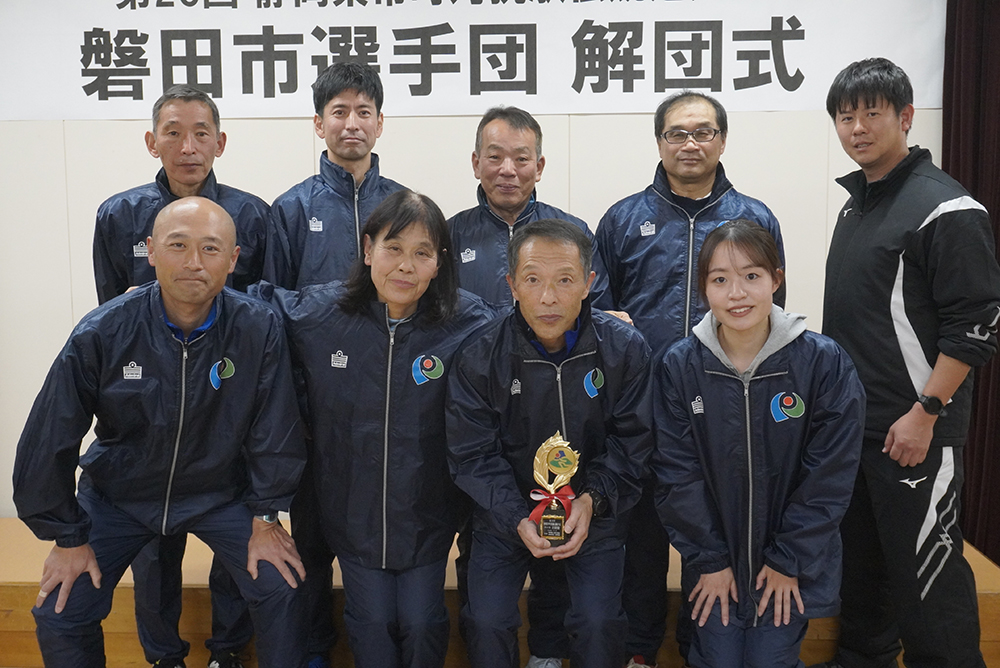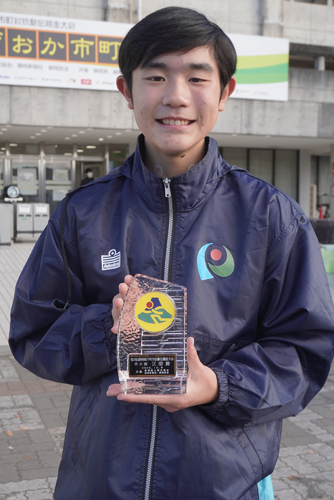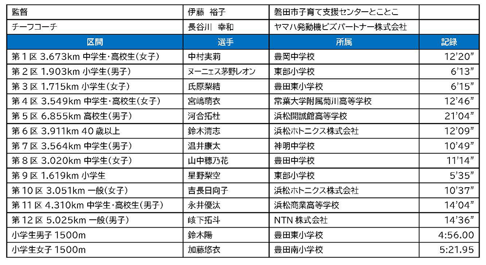 今回は2時間17分42秒のタイムを記録、これは前回の2時間21分08秒を大幅に縮める好タイムです。好天に恵まれ全体的にハイペースとなった今大会、第1区の中村選手(豊岡中)が市の部7位の走りで流れを作ると、第7区温井選手(神明中)が区間賞の走りを見せるなど、どの選手も精一杯の走りでタスキを繋ぎました。最後は第12区の峐下選手(NTN)が気迫の走りで市の部11位でフィニッシュ。入賞にはあと一歩届かなかったものの、前回より大幅にタイムを縮められたことが評価され、敢闘賞を受賞しました!また、併催事業の小学生1500メートルでも磐田市の選手が大活躍!走った選手もサポートにまわった選手も、全員が一丸となって参加してきました。