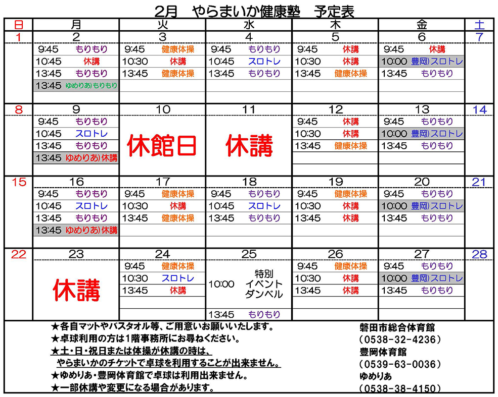 磐田市総合体育館(0538-32-4236) 豊岡体育館(0539-63-0036) ゆめりあ(0538-38-4150)