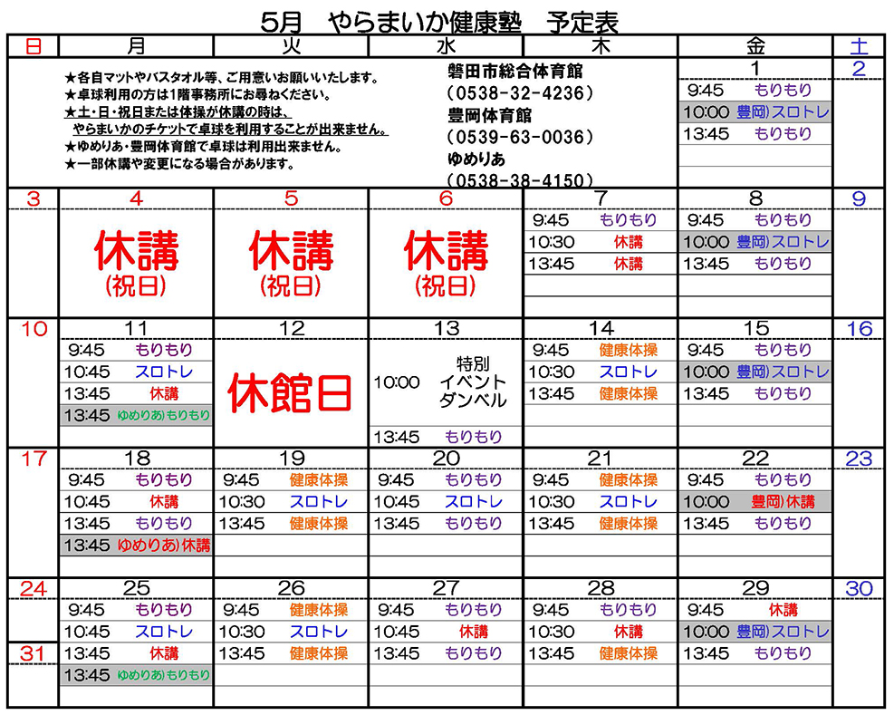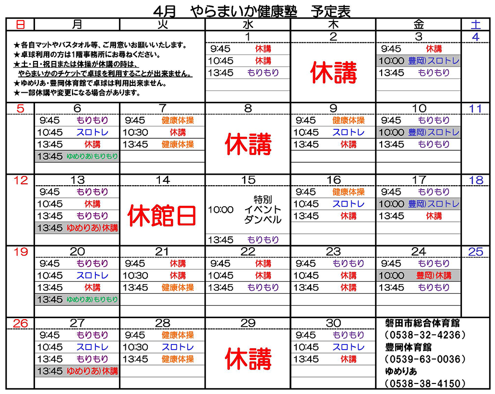 磐田市総合体育館(0538-32-4236) 豊岡体育館(0539-63-0036) ゆめりあ(0538-38-4150)