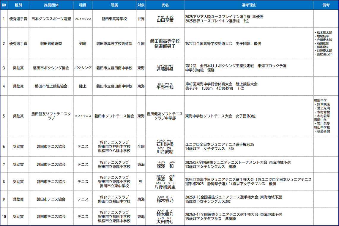 協会では全国大会などで優れた成績を収めた個人・団体、さらにはスポーツの普及や指導において顕著な功績を残された個人・団体を表彰しており、この表彰式を毎年2月と6月の時期に行っています。 1月23日に、表に掲げる方々を表彰いたしました。 受賞の皆様、おめでとうございます。今後の更なる活躍を期待し、応援いたします。