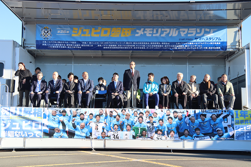 昨年できなかったステージでの開会式には、大会会長の草地博昭磐田市長、大会副会長の浜浦幸光(株)ジュビロ代表取締役の他大会役員が40名ほど並んだ。その中に、ジュビロ選手会の松本昌也選手会長がいた。松本選手は最終戦で決勝のヘディングシュートを決めてくれたヒーローだ。私の開会宣言、草地市長と浜浦社長の挨拶の後、松本選手が中央マイクに立つと万雷の拍手と声援が巻き起こった。松本選手からは、「応援してくれたこと、J1に復帰できたことのへの感謝と今日のマラソンでは自分たち選手はランナーの皆さんを応援する側に回る」むねの挨拶をいただいた。