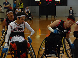 “ツイン”とは、ゴールが2つあるという意味です。通常のゴールの手前に低いゴールが置かれ、障害の程度によってシュート方法が異なります。低いゴールのすぐ横まで行ける赤ハチマキの選手にパスをつないで効果的に得点しようとする攻撃側のチーム、それを阻止しようとサークル手前でブロックする守備側のチーム、車椅子がまともにぶつかり合うシーンは迫力満点で、中には車椅子がひっくり返る場面もありました。