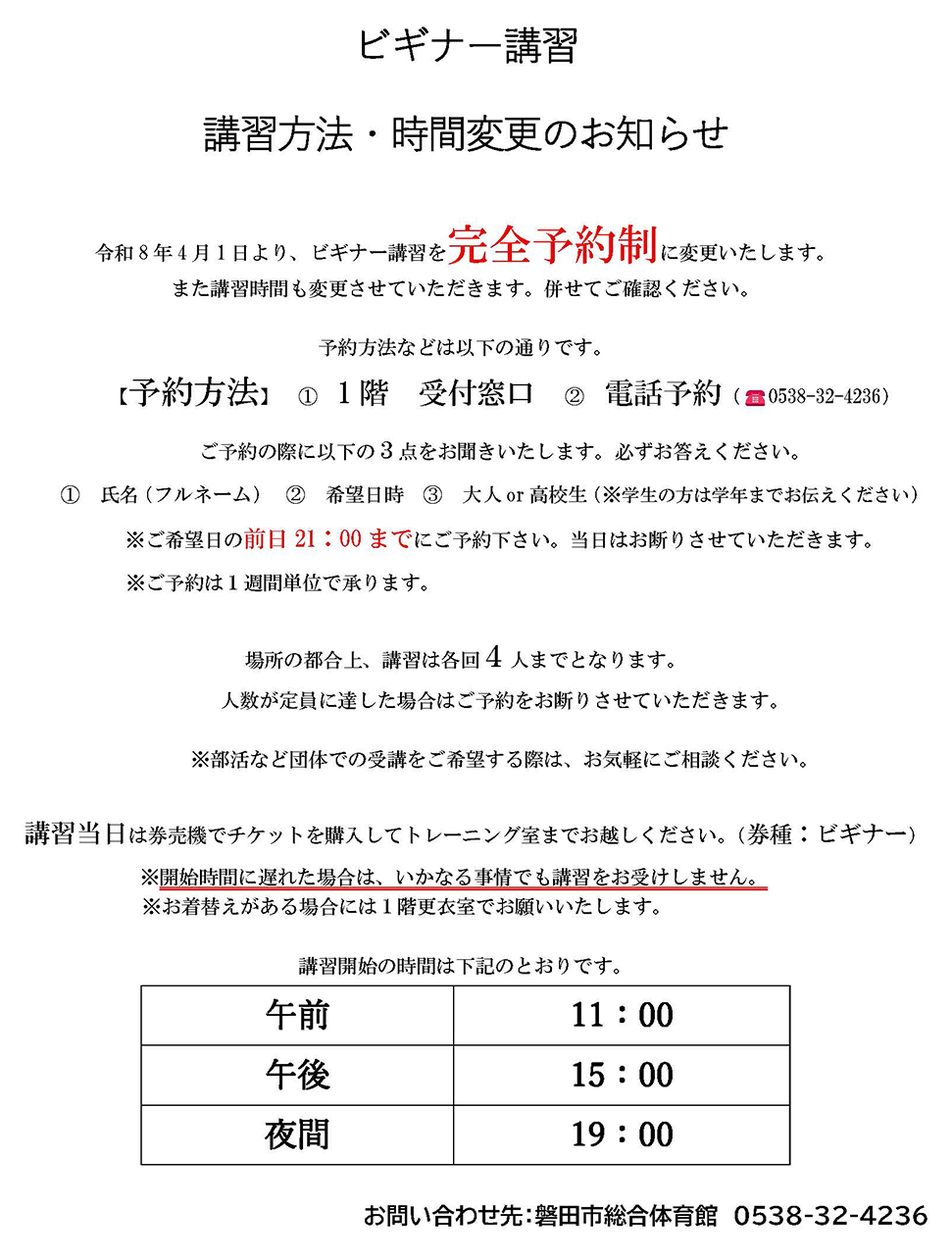 高校生以上の方で、これからトレーニング室を利用しようとお考えの方、まずはビギナー講習を受講して下さい。ビギナー講習は、経験や知識の有無に関係なく必ず受講してください。 高校生の方は、在学を証明するものを持参してください。